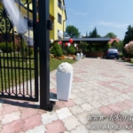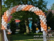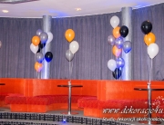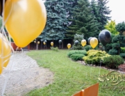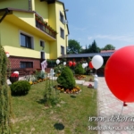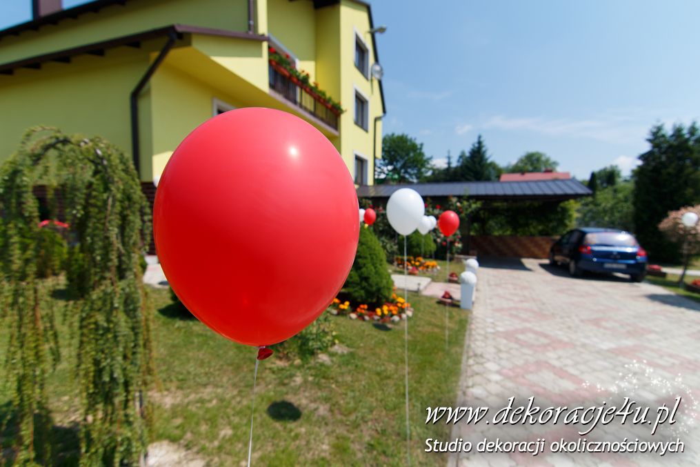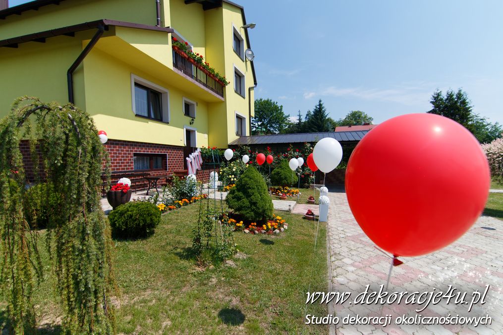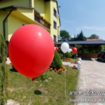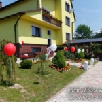Dekoracja domu Pani, balony z hele, kule kwiatowe w donicach – delikatne podkreślenie uroczystości.