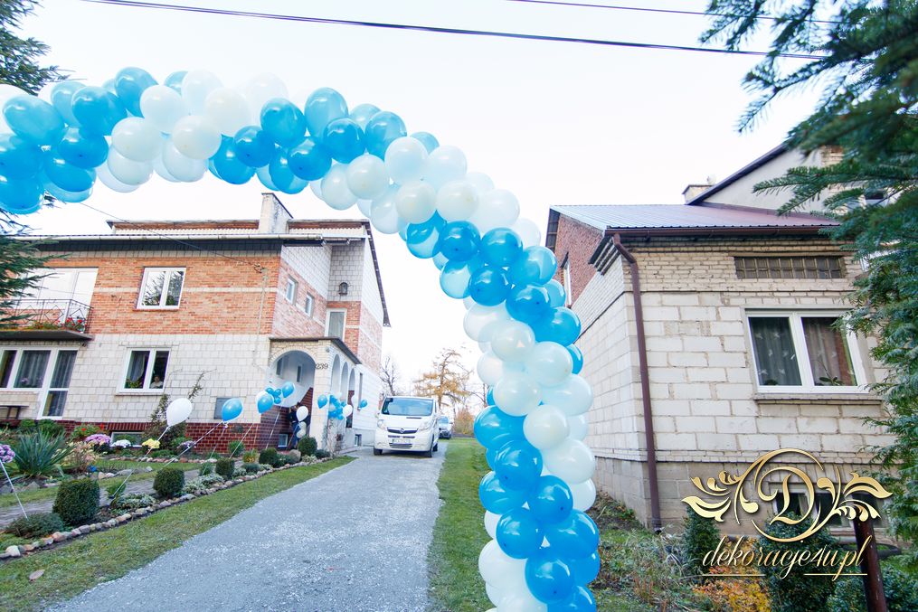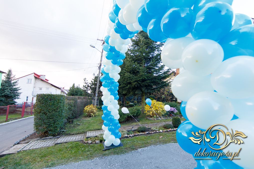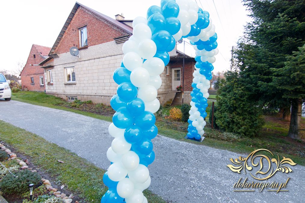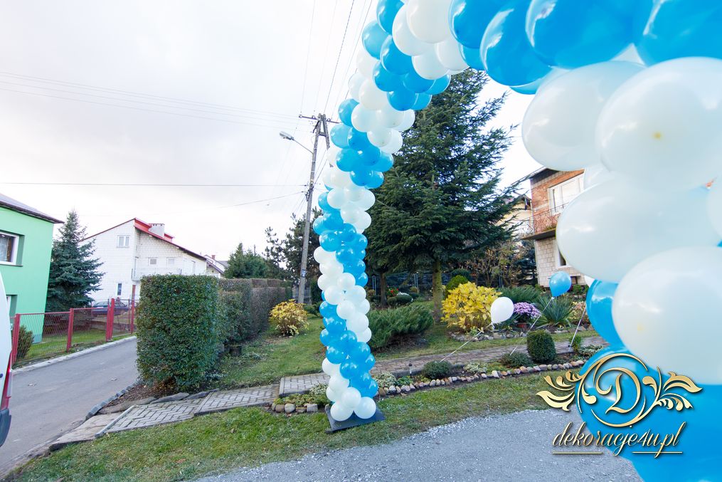Piękny kolor niebieskiego połączony z bielą. Nawet wiatr, który był podczas dekoracji nie przeszkodziło w stworzeniu pięknej bramy balonowej dla Pani Młodej.