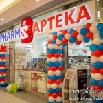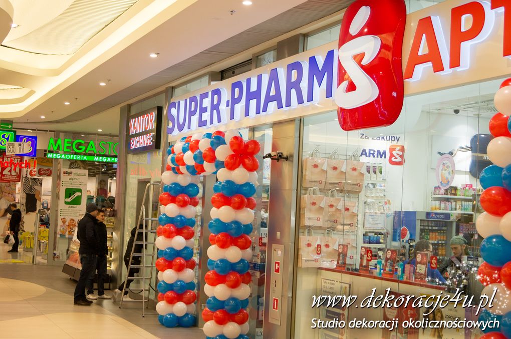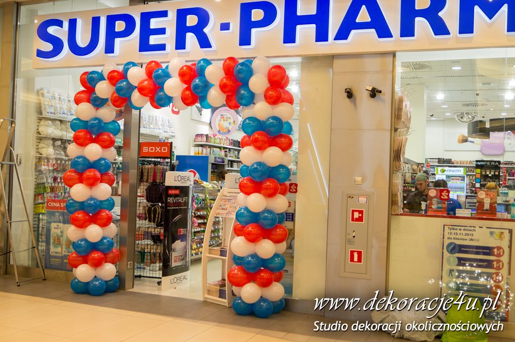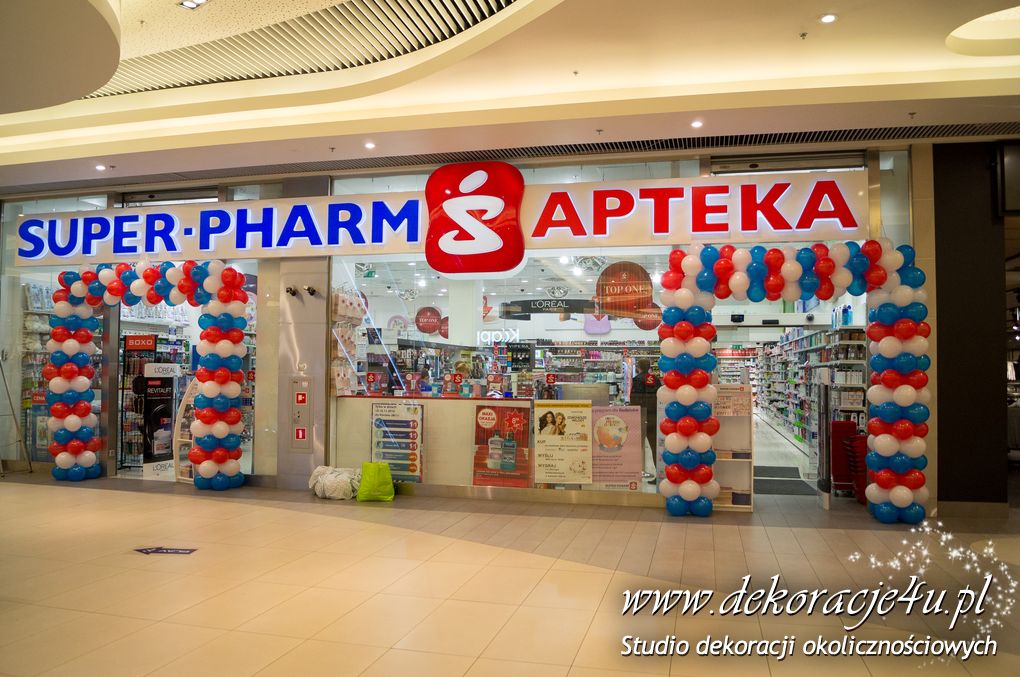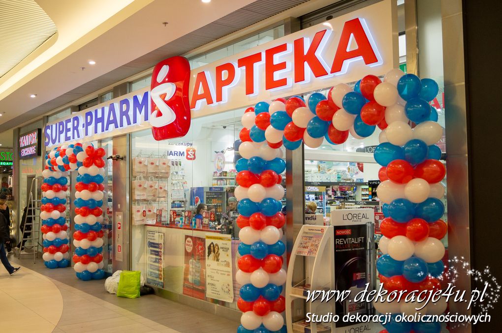 Urodziny galerii Rzeszów nie mogły się odbyć bez naszej dekoracji balonowej w Sieci aptek SuperPharm. Brama wykonana pod kolory loga firmowego.