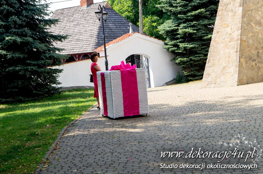 Wspaniały prezent dla Młodej Pary tym razem balony białe serca i malinowe. Całość pięknie ustawiona przed kościołem w Pruchniku. Zaskoczenie gości słyszeć na filmie :)